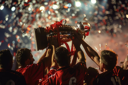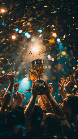 Triumphant hands hold trophy in confetti shower, celebrating victory without logos or text