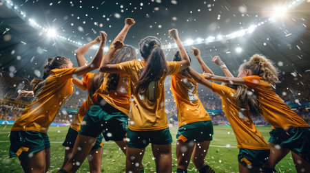 Team lifting a trophy in a stadium, holographic fireworks, watercolor effect, rich colors, celebratory atmosphere