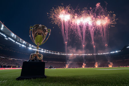 Fireworks burst above a filled stadium, celebrating a championship victory. A glaming trophy rests on the field, showcasing the excitement of the moment.