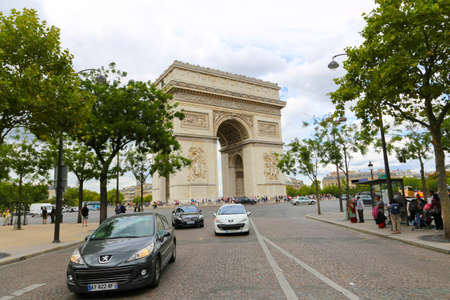 October 14, 2017, Paris, France, traffic on the Champs Elysees on the background of the Arc de Triomphe