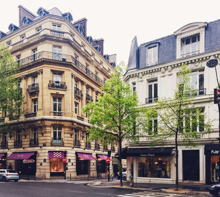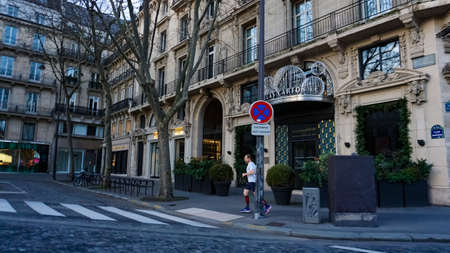 Paris, France circa January, 2020: Parisian architecture and historical buildings, restaurants and boutique stores on streets of Paris, France
