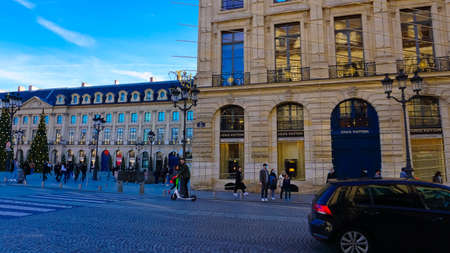 Paris, France - January 01, 2022: People going near Place Vendome, wich was laid out in 1702. The original Vendome Column at the center of the square was erected by Napoleon I.