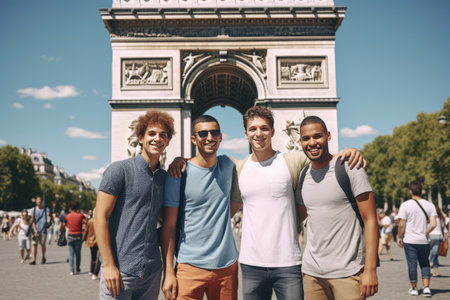 Embracing the Radiance: Young and Diverse Male Friends Rallying near Triumphal Arch on a Sunny Day