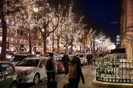 Paris, France - January 01, 2022: People going at Elysian Fields, Champs-Elesees in Paris. Paris - the capital of France. Main political, economic and cultural center of France.