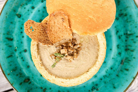 Mushroom cream soup with garnish, top view. Soup with mushrooms and toasts in bread pot, down view.