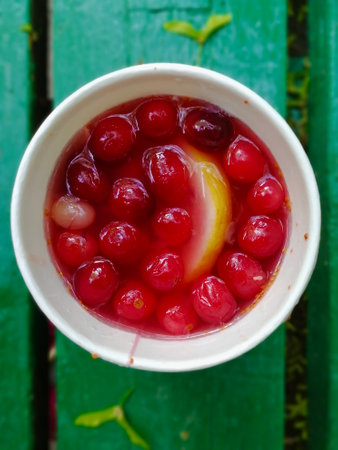 Thai dessert, ruby red sticky flour stuffed with truffle in coconut milk decorated with jackfruit