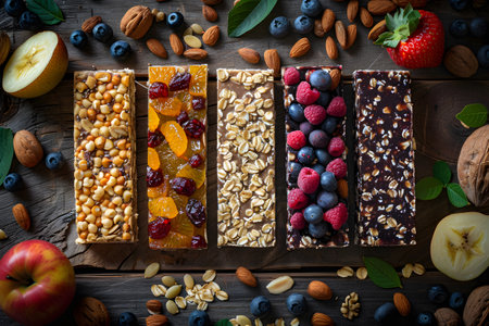 A beautiful array of assorted candy bars made with fruit and nuts, showcased on a stylish marble background, perfect for healthy snacking ideas.