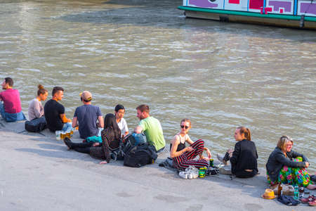 VIENNA, AUSTRIA - MAY 25: Many people are relaxing with alcohol drinks on a day off in a beautiful summer weather on the banks of the Danube Canal(Donaukanal) in Vienna, Austria, on May 25, 2019.