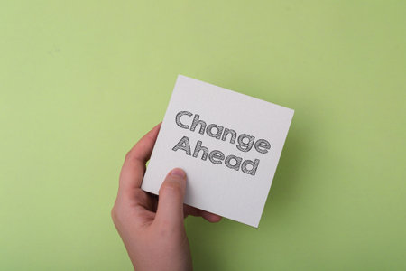 A hand holding a white card with the word change ahead written on it. The card is on a green background