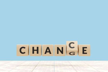 Wooden cube flip with word change to chance on white table blue background. Business conceptual. 3D illustration rendering.