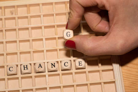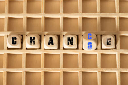 Changing the word Change into Chance. Wooden dices spelling words Change and Chance.