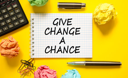 Give change a chance symbol. Concept words phrase Give change a chance on beautiful white note. Colored paper Calculator Beautiful yellow background. Business Give change a chance concept. Copy space.