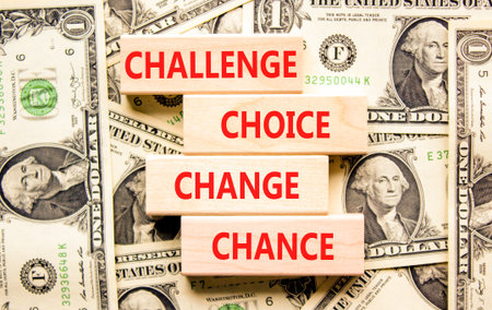 Challenge choice change chance symbol. Concept words Challenge choice change chance on beautiful blocks. Beautiful dollar background. Business Challenge choice change chance concept. Copy space.