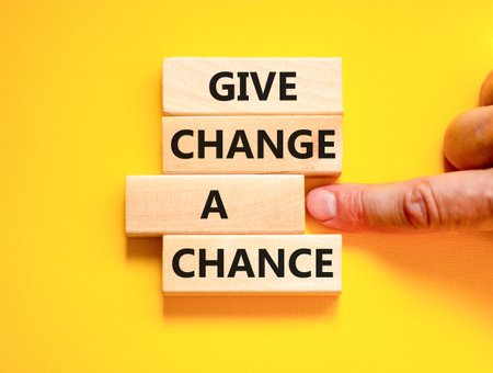Give change a chance symbol. Concept words phrase Give change a chance on beautiful wooden blocks Beautiful yellow paper background. Businessman's hand Business Give change a chance concept Copy space