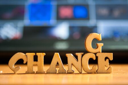 Wooden cubes with letters on the table transform wording change to chance. Copyspace for ad.