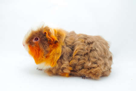 long haired guinea pig in front of a white background