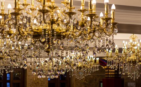Crystal chandelier in the interior of the hotel, bokeh
