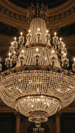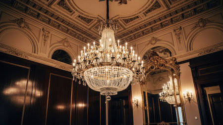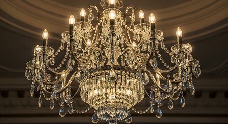 Elegant interior featuring a dazzling crystal chandelier with multiple lights. The luxurious fixture creates a warm ambiance in the surrounding space, suggesting opulence and refined taste.