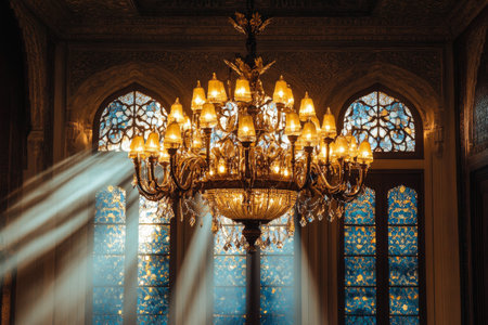 A beautiful chandelier hangs from the ceiling in a lavish room, emitting a warm glow. The arrangement of crystals reflects light, creating a mesmerizing display of rays in the atmosphere.