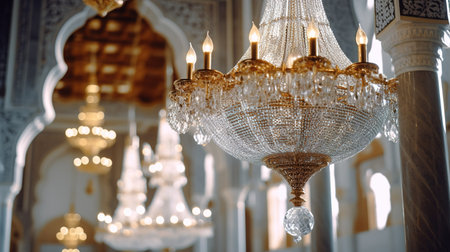 Beautiful luxury crystal chandelier in the mosque, closeup