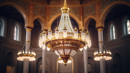 Beautiful luxury crystal chandelier in the mosque. Selective focus.