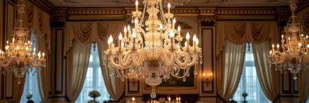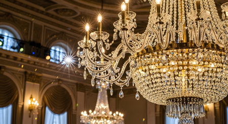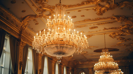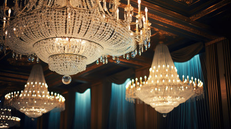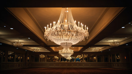 Elegant crystal chandeliers in a luxurious ballroom interior. That the image is generated using AI.