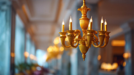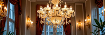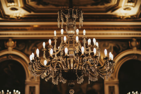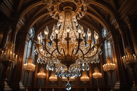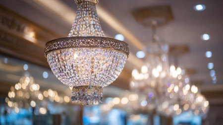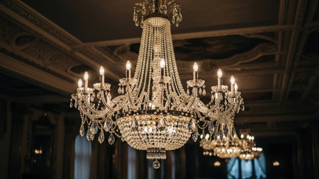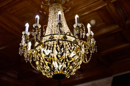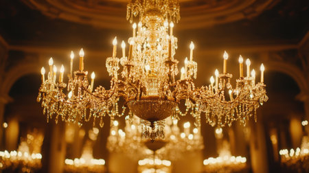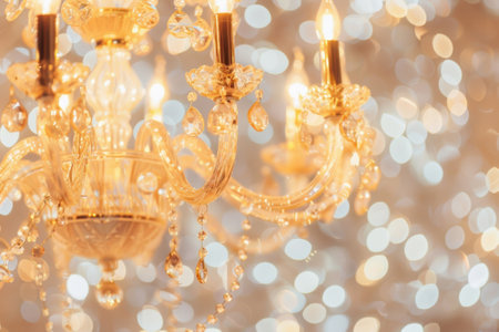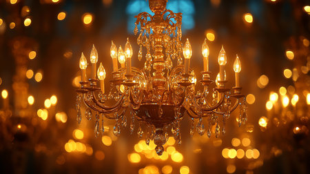 Experience the exquisite beauty of a crystal chandelier in a luxurious interior. This image showcases an elegant and ornate chandelier with shimmering crystal drops, casting a bright, golden glow. Soft candlelight and a blurry background create a romantic bokeh effect, highlighting the sparkle and glamour. Perfect for illustrating luxury decor, event planning, wedding venues, or showcasing upscale interior design. This vintage lighting masterpiece adds a touch of classic sophistication to any project.