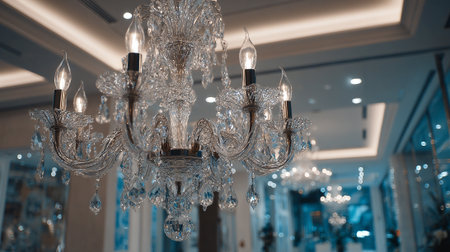 An elegant crystal chandelier hangs gracefully from the ceiling, adorned with shimmering crystals that catch the light. The illumination from the lights creates a warm and inviting atmosphere with a sophisticated style.