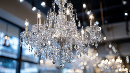 This image showcases a sophisticated crystal chandelier with multiple lights, sparkling in an indoor setting. The blurred background highlights the chandelier's intricate design and adds to the ambiance.