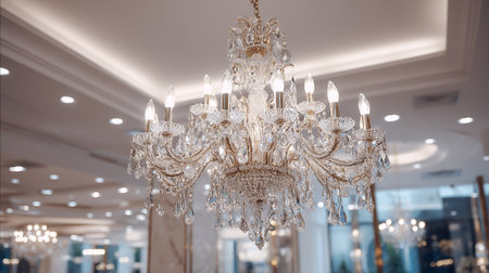 A chandelier hanging from the ceiling of a store. AI generative image.