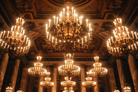 Glowing chandeliers illuminate a dimly-lit room, creating a moody and sophisticated ambiance, Glimmering chandeliers casting a soft glow