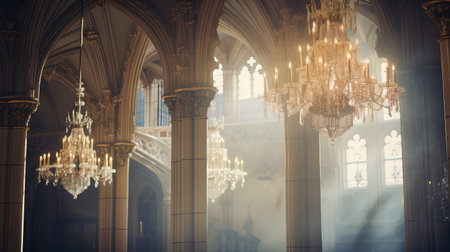gothic lighting design, elegant chandeliers dangle from the tall ceiling, illuminating the detailed gothic dcor with a soft glow