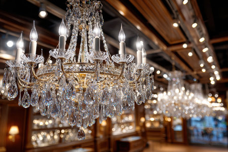A sparkling crystal chandelier illuminates a blurred retail interior