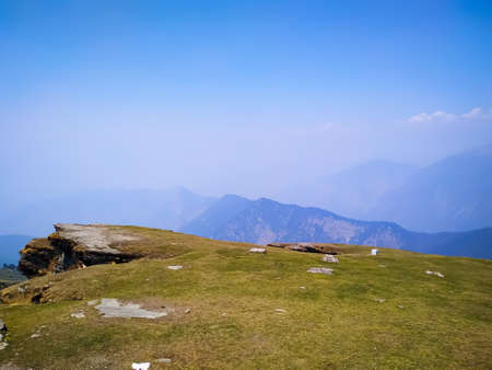 Panoramic view Himalayan mountains view from Chandrashila summit, Chopta. Chandrashila is a peak in the Himalayan ranges in Uttarakhand state of India. It lies at an altitude of 12,083 ft from the sea