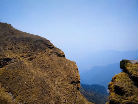 View of Himalayas mountain range with visible silhouettes through the colorful fog from Khalia top trek trail. Khalia top is at an altitude of 3500m himalayan region of Kumaon, Uttarakhand, India.
