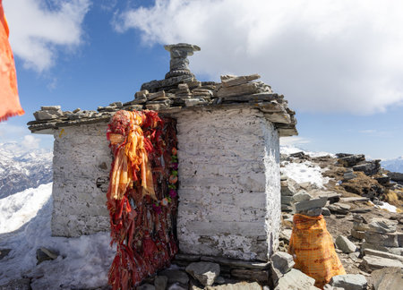 holy shrine with sacred flags on snow-capped peak at sunrise image is taken at chandrashila trek summit tungnath chopta uttarakhand india.