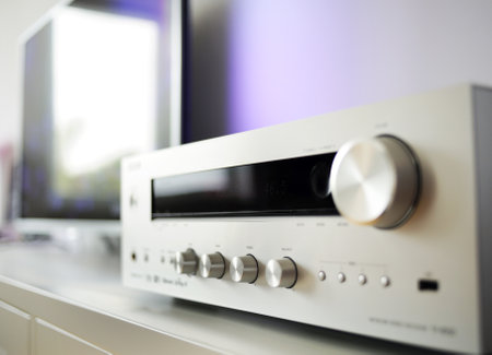 Modern Hi-Fi stereo amplifier tuner with CD tray open as seen from lateral low angle