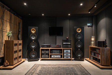 A stylish living room showcases elegant audio equipment and a sleek television, enhanced by natural light and cozy furnishings, creating a welcoming atmosphere.