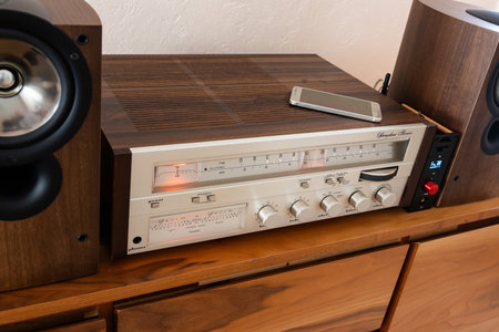 Home Vintage Stereo Receiver with Loudspeakers and Headphones Placed on Wooden Retro Shelf. Smartphone as a Source, New and Old Technology Working Together.