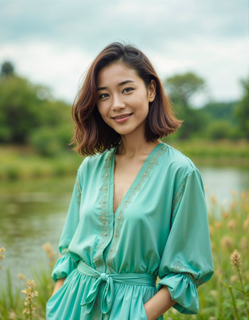 Beautiful Asian woman smiling with outdoor scene in matte style