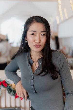 Portrait of a beautiful young Asian woman holding a cup of coffee