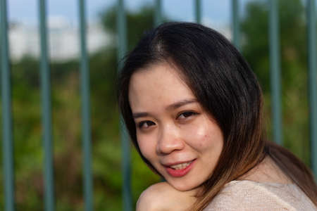 Asian chinese woman with tanned beauty skin portrait in a green garden with sun light for beauty and skin concept.