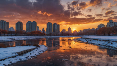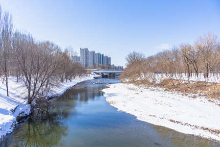 Winter landscape with frozen river and skyscrapers in Beijing, China