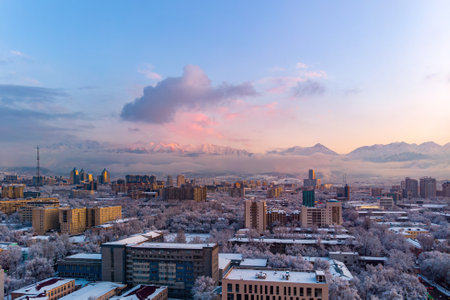 View of the evening city of Almaty after heavy snowfall. The trees are covered with snow, the sun beautifully illuminates the mountains with sunset pink light