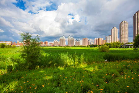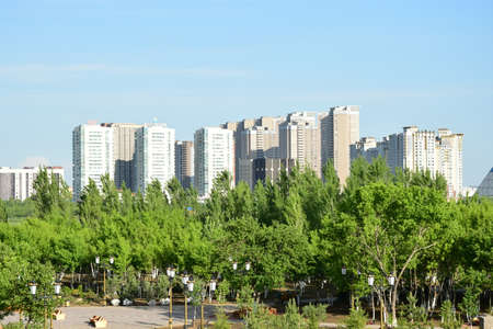 High building in Astana at the background of the city early in the morning. Kazakhstan Real Estate.