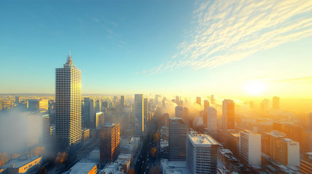 Aerial view of the city at sunset in winter.