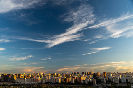 A beautiful panorama of a big city at sunset, blue sky and crescent moon and setting sun illuminate multi-storey residential buildings. High quality photo