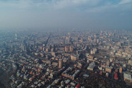 Early winter morning, fog and smog over the city of Almaty, Kazakhstan. Panoramic photo