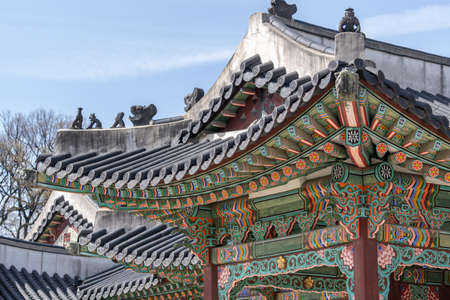 various architecture and traditional historic elements in Changdeok gung palace in Seoul, South Korea.