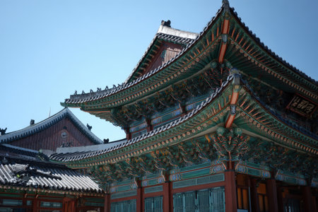 Side view of Injeongmun Gate at Changdeokgung Palace on blue sky background in Seoul, South Korea. Changdeokgung Palace is a popular tourist attraction of Asia.